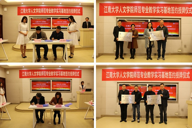 田良臣、蔡爱国分别与中小学领导签订了教学实习基地协议书,顾志国与沈贵鹏、惠恭健等为实习基地授牌。
