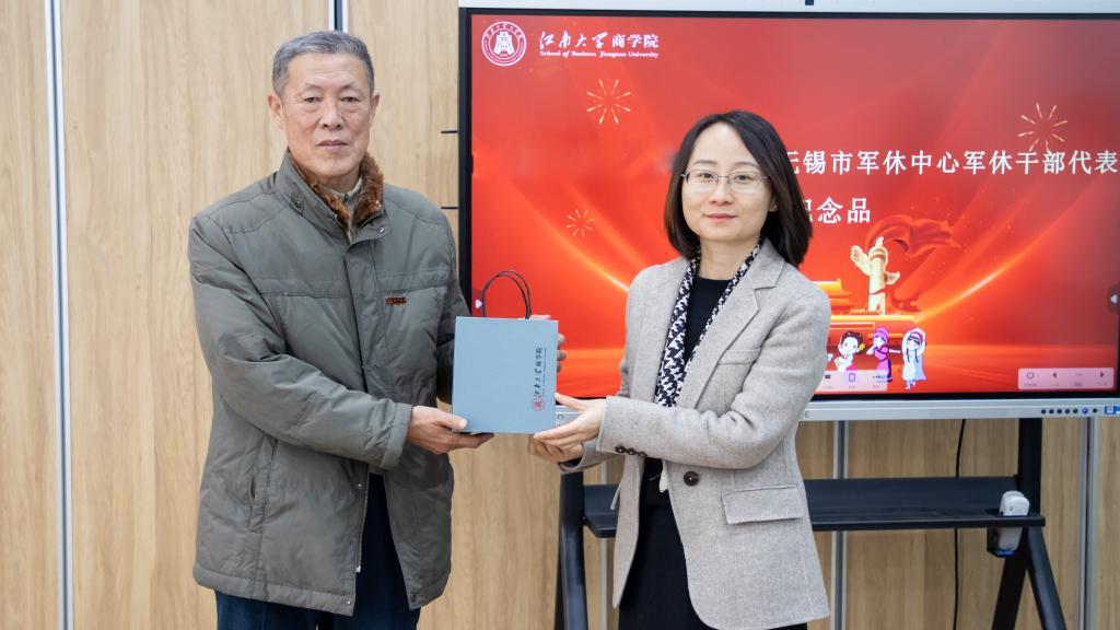 孙小芳向无锡市军休中心军休干部代表李景贺赠送纪念品。