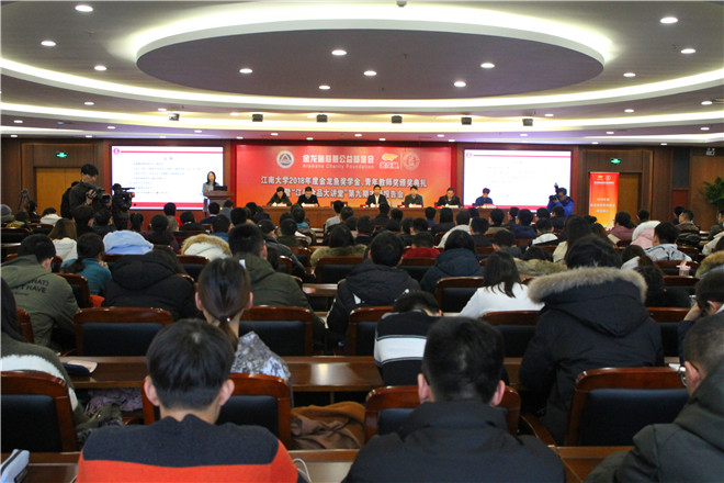 1月7日下午,江南大学2018年度金龙鱼奖学金、青年教师奖颁奖典礼暨“江南食品大讲堂”第九期主题报告会在图书馆5楼报告厅举行。益海嘉里集团研发中心总监、丰益(上海)生物技术研发中心有限公司总经理徐学兵,益海嘉里集团研发中心副总监、丰益(上海)生物技术研发中心有限公司副总经理姜元荣,益海嘉里集团研发中心资深研究员牛其文、江南大学党委副书记戴月波,社会资源处处长黄敏,学生工作处处长张菁燕,研究生院副院长武美萍,食品学院、生物工程学院、化学与材料工程学院党委副书记,以及获奖师生、学生代表等300余人参加颁奖典礼。颁奖典礼由研究生工作部副部长单筱婷主持。