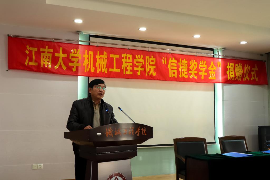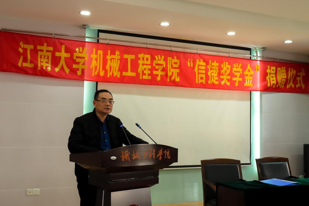 2019年3月12日下午,江南大学机械工程学院“信捷奖学金”签约捐赠仪式在机械工程学院C302举行。无锡信捷电器股份有限公司副总经理过志强先生、机械设计部经理房海英女士、校企合作部经理王正堂先生、人事专员张妍女士及校社会资源处副处长窦新华、院党委书记黄正明及副书记方俊出席了本次签约仪式。