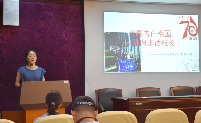 香港大学游学团的陆雨洁同学则以亲身经历为大家带来了他们的香港游学体验。他们经历了面对“和平示威”时的惶恐不安,心中的爱国之情更是油然而生,某天在去港大的大巴上看到国旗和区旗并列在风中飘扬,一种感动不禁涌上心头。香港自古以来就是中国的一部分,我们要做的就是做好自己,相信香港,相信政府,相信人民群众。