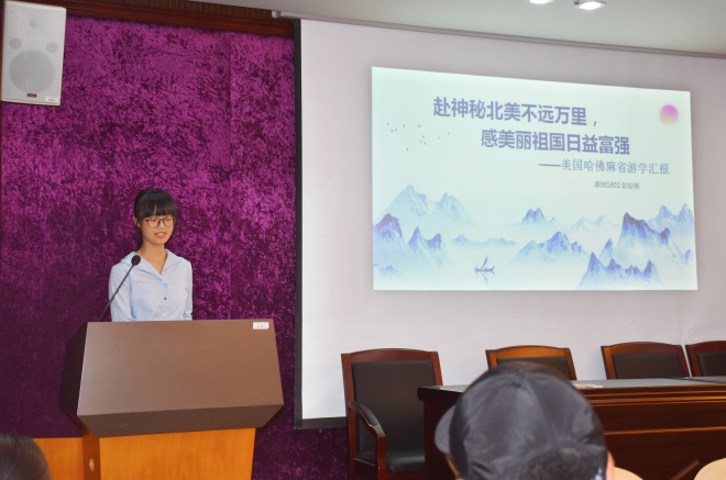 除了学习丰富多彩的知识、领略多姿的异国风光,他们也在与异国文化不断地碰撞与交融中产生了更加强烈的爱国之情。短短十二天的美国之行,让同学们体会到了中国主权问题在国际上的争议,明白了某些西方国家对中国快速发展的压制,对中国崛起的阻止,也让大家领悟到要想有底气就要图国强。在美国的亲眼所见使大家切实体会到了我们与美国等发达国家的差距在缩小,我们国家的交通十分便利,地铁、高铁、高速公路十分发达,高铁技术领先世界里程全球第一,甚至波士顿地铁明年要换成中国制造。看到这些,谁不为祖国的日益强盛而骄傲呢?报告的最后,彭安祺同学倡议同学们要在学好专业课的同时,要多关注国计民生,关心国际时事,立足当下,共筑伟大中国梦。