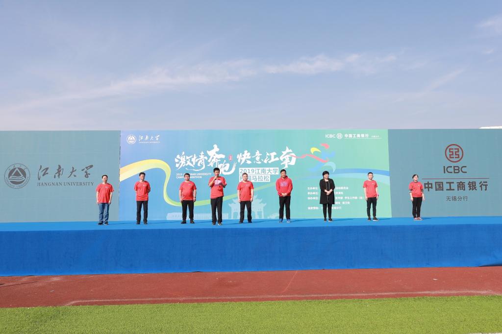 11月16日下午,江南大学体育中心运动场上人头攒动,“深海蓝”“中国红”“青春绿”“活力橙”“校友白”汇成一片五彩缤纷的欢乐海洋。“激情奔跑、快意江南”2019江南大学校园马拉松赛事火热开启,近5000师生及全国10余个城市的千名校友隔空联动,庆生母校。本次活动由江南大学体育运动委员会携手中国工商银行无锡分行联合举办。校党委副书记戴月波,校党委副书记、纪委书记刘淼和中国工商银行江苏分行副行长姜乔、无锡分行行长汪超等领导出席。