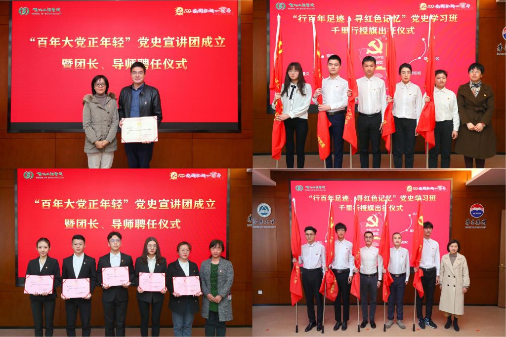 活动中,倪守红、张影陆、倪松涛共同揭幕“百年华诞百天倒计时牌”,正式启动学院庆祝建党百年之“百”系列活动,为迎接七一华诞注入昂扬向上的精气神。徐光昊与王维共同揭牌“滨湖团区委——江南大学生物工程学院党史学习联盟”,让青年宣讲团有阵地、有资源、有平台。“百年大党正年轻”党史宣讲团正式成立,张影陆颁发导师聘书,李凤梅颁发宣讲团团长聘书,侯勇在导师代表动员讲话中为生工学院将党史学习与社会实践相结合的特色党建品牌活动点赞,并预祝党史宣讲团宣讲取得丰硕成果。张菁燕、杨飏为十个“行百年足迹、寻红色记忆”党史学习班出征授旗,开启沉浸式、情景式、互动式的社会实践。周云龙宣读了生物工程学院建党百年系列活动方案,正式发布“波澜壮阔奋斗百年路,凝铸一流启航新征程”生物工程学院庆祝中国共产党成立100周年主题活动内容。活动后,王维开讲“学党史,知党情”党课第一讲。