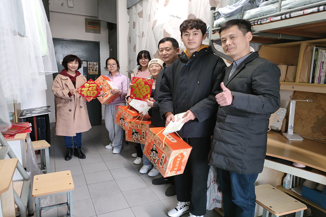 随后,一行人来到榴园看望留校过年的本科生张舒姗,预科生贾新玉,乔力番·巴特尔拜克和买吾兰江·买合木提。院领导和同学们亲切交流,了解大家留校生活状况,安慰大家放宽心,学院和学校永远是大家最坚强的后盾。同时叮嘱大家和家人保持密切联系,让父母放心,时刻把安全放在第一位,去公共场所要戴好口罩,做好防护。院领导为同学们送上旺旺大礼包,祝同学们新的一年学习生活更加旺;并送上林清玄的人生主题经典散文集《人生最美是清欢》,希望同学们在复杂的世界里,做一个简单的人,以清静心看世界,以欢喜心过生活,最后给同学们送上春联和福字,希望大家过一个喜庆祥和,虎气冲天的吉祥年。