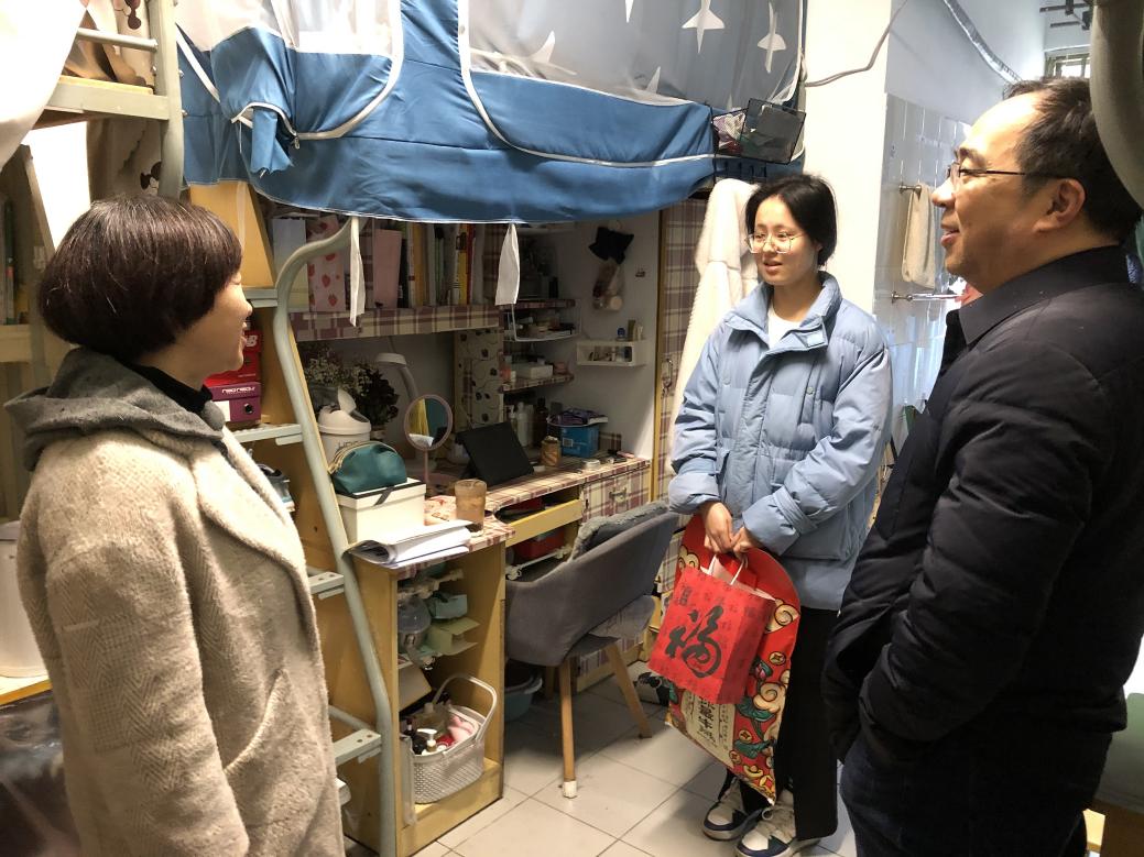 走访过程中,姚剑英、杨晖一行辗转5栋学生宿舍楼,走访了每一个留校学生宿舍,并一一询问了留校学生在校期间的学习生活情况,鼓励同学们积极调整心态,保持健康愉悦的学习生活状态,共克时艰。桂园的留校生主要是新疆籍学生,因为疫情防控的原因不能返乡,党委书记姚剑英叮嘱同学们在锡留校期间也要注意做好个人防护,常与家人联系,过个平安吉祥年。杏园、李园和桔园主要是陕西籍留校学生,因疫情防控要求留校至今,在收到学院领导老师送来的新春慰问品时表示,老师们的到来让他们倍感温暖。最后,他们来到学院研究生工作室,看望了正在写论文的赵震。家住陕西渭南的赵震因疫情防控要求不能返乡,随即决定在校踏实写论文,院长杨晖在交流中鼓励学生合理安排时间,留校期间不仅要把论文写好,也要生活好,让父母放心,让老师放心。