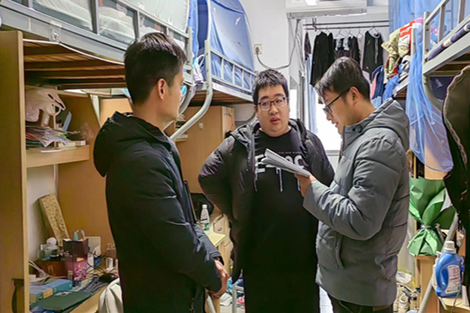 走访寝室递温情,浓浓关怀暖人心。2月21日,2023年硕士研究生初试成绩公布。陈周、辅导员李丹和班主任曹磊、王继成、朱承澄等老师当日下午走访学生寝室,第一时间了解学生考研初试成绩,正面观察学生状态,做好人文关怀。走访中,老师们与同学亲切沟通,向取得优异成绩的同学表达热烈祝贺,并细致指导他们制定复试规划。同时也暖心关怀鼓励失利的同学,耐心倾听他们的想法,引导他们振作起来,投入就业求职。通过走访交流,学院全面摸排了学院学生的考研初试情况,提振了积极向上的考研复试信心,营造了抢抓机会的调剂氛围。