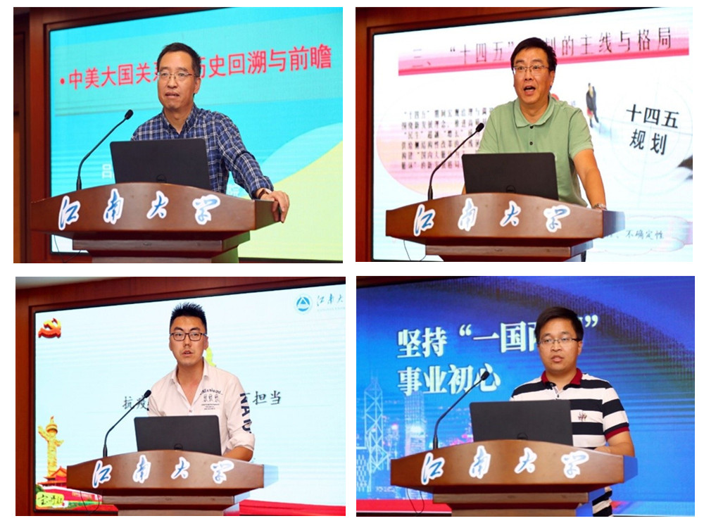 随后,马克思主义学院吕庆广、冯皓、孙晨光、张乐四位老师分别介绍了本学期“形势与政策”课教学的专题内容。吕庆广老师围绕中美关系这一长期的热点问题进行了讲解,他指出在中美关系问题上,我们要用历史的眼光来看待中美关系,立足于中美关系发展的历史,探讨中美关系的未来及中国应对之策。冯皓老师以“十四五”规划的主线与格局为题展开说课,他指出供给侧改革仍是主线,目前所提出的国内国际双循环是应对当前形势的重要举措,着重点仍在供给侧结构性改革上。孙晨光老师围绕“疫情防控与人类命运共同体”这一主题展开,主要讲解了疫情对意识形态和行为实践的影响,疫情冲击下加强应对之策、捍卫全球化成果以及疫情防控中的家国情怀与青年担当这三个问题。张乐老师以“坚持‘一国两制’事业初心;决胜全面小康,共襄复兴伟业”两个主题展开讲述,指出在教学过程中要奏响爱国主义主旋律,为全面建成小康社会共同努力。