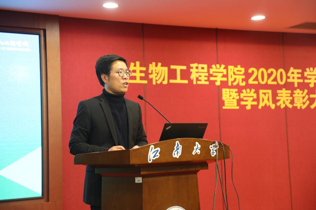 会上,周云龙首先做关于生物工程学院2020年学风情况的报告。他强调了学风建设对于社会整体和学生个体的价值意义,并从学院学风建设的组织机构、制度构建、品牌塑造等多个角度阐述了学院学风工作的设计逻辑。重点阐述了思政教育融入学风建设、“平板菌”系列活动、学科竞赛体系等方面的特色,总结了2020年学风建设取得的显著成果。最后,周云龙结合具体案例,给同学们上了一堂生动的诚信考试主题教育课,并勉励全体同学让勤奋学习成为青春飞扬的动力,让增长本领成为青春搏击的能量。