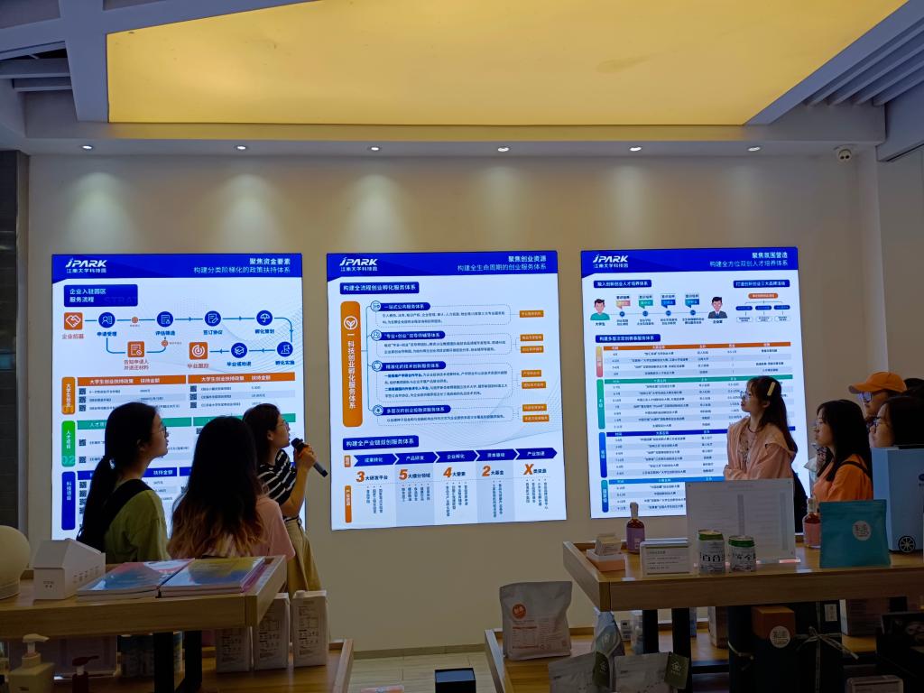 同学们首先来到大科园展厅,陈雪梅向大家介绍了大学科技园的基本状况,并对无锡市大学生创业政策进行深入解读。她表示,江南大学国家大学科技园是校地合作共建的大学生创业孵化示范园区,旨在依托江南大学学科优势,推动创新创业人才培养,服务于无锡市大学生、中高层次人才创业就业。大学生创业园始终秉承“以人为本”“双创育人”工作理念,探索实践“生创师导”大学生双创特色孵化模式,培育以大学生为主体、以教授团队为支撑,以健康食品、智能制造、产品设计等江南大学优势学科为基础的双创生力军。她强调,大学生创业园迄今累计孵化212家实体,总体孵化成功率98.3 %,培育1家全国创新创业大赛优秀企业、1位江苏省大学生创业标兵、3位福布斯30U30精英等获奖项目。随后,同学们在唐雨洁指引下,来到展示体验中心参观科技园的主要产品,化妆品、包装设计、健康食物……琳琅满目的产品激发了同学探索求知的兴趣。