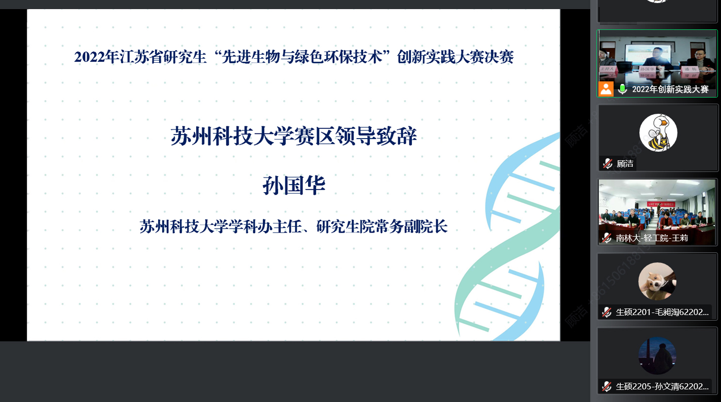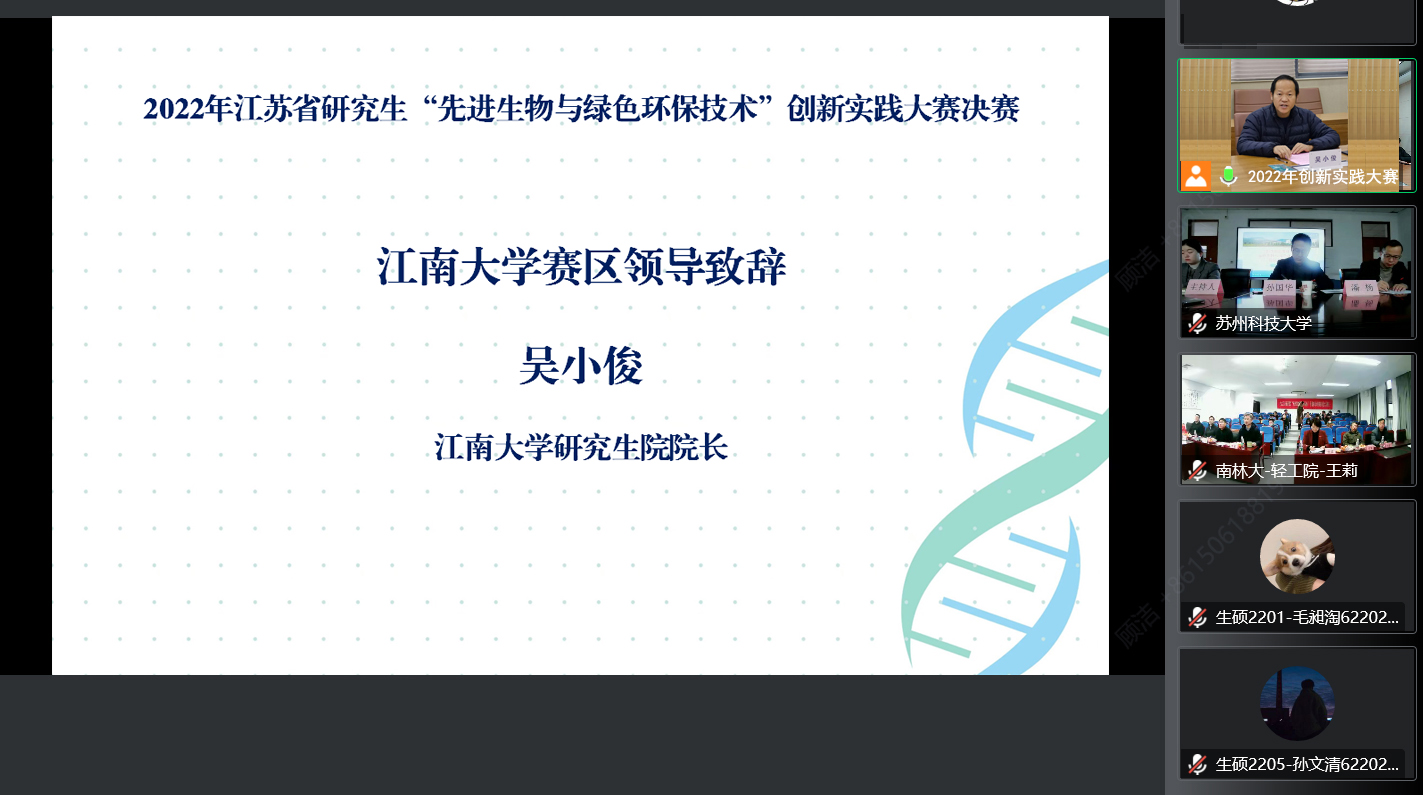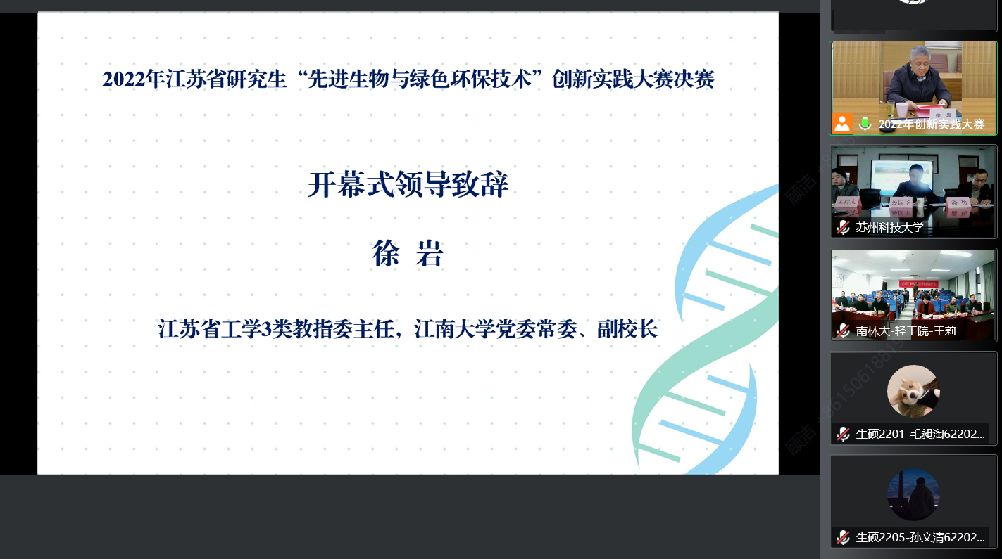 12月9日,由江苏省工学3类研究生教育指导委员会主办,江南大学、南京林业大学、苏州科技大学、江苏大学联合承办的2022江苏省研究生“先进生物与绿色环保技术”创新实践大赛拉开帷幕。来自厦门大学、中国科学院青岛生物能源与过程研究所、华东理工大学、西安交通大学等20余所高校的400余名师生通过线上方式参加了本次大赛。江苏省工学3类教指委主任、江南大学党委常委、副校长徐岩教授,江南大学研究生院院长吴小俊教授,南京林业大学研究生院副院长翟胜丞教授,苏州科技大学学科办主任、研究生院常务副院长孙国华教授,江苏大学研究生院常务副院长蔡英凤教授等出席了开幕式。开幕式由江南大学生物工程学院副院长聂尧主持。