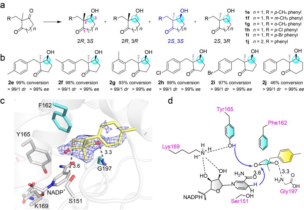 由于2,2-二取代的1,3-环二酮有两个手性中心,因此在合成化学中制备光学纯的2,2-二取代-3-羟基环酮是一个很大的挑战。考虑到CbAR可以适应不同的大位阻底物(Fig. 1d),因此作者使用CbAR对1e的还原进行了测试。结果表明,虽然CbAR对这种底物的催化效率较低,但是具有良好的立体选择性。随后,经过基于结构的蛋白质工程改造,作者选择活性最高的CbAR-H162F突变体进行了底物范围的探索。结果表明H162F对于几种2,2-二取代-1,3-环二酮的底物都有较好的转化率和极高的立体选择性(Fig. 4a, b)。随后,作者通过H162F-1e复合物的晶体结构揭示了H162F催化这类底物的分子机制(Fig. 4c, d)。