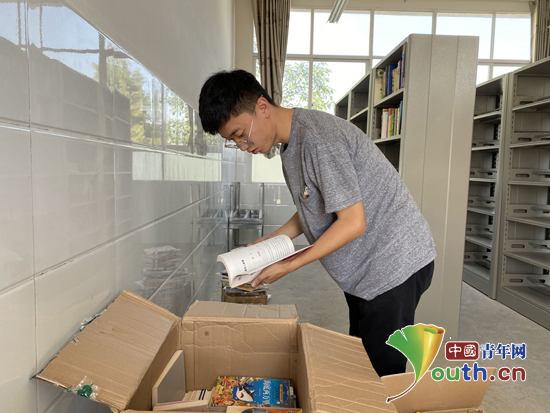 图为燕山大学研究生支教团成员王谡阳整理募捐的爱心图书。江南大学研支团 供图