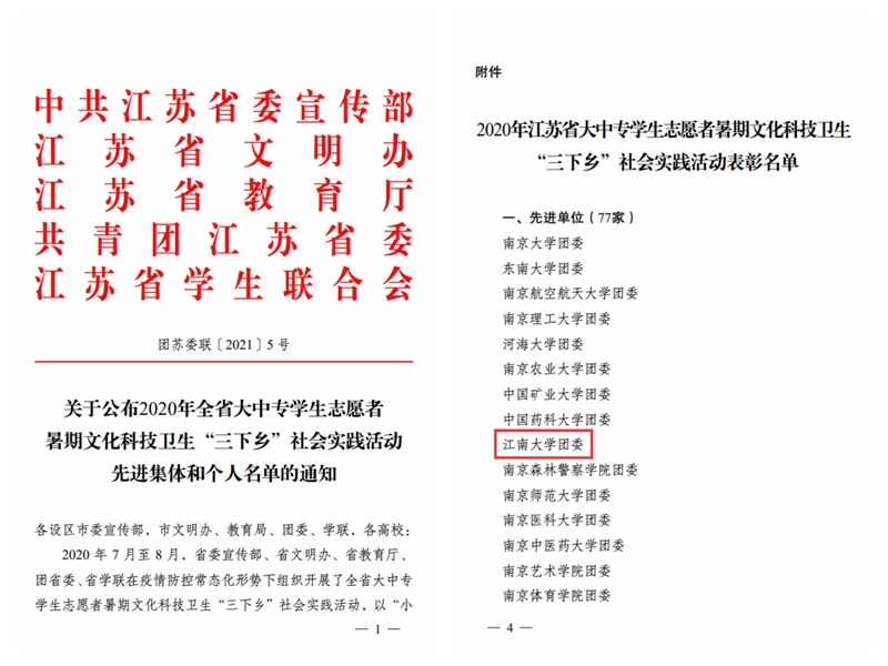 近日,在中共江苏省委宣传部、江苏省文明办、江苏省教育厅、共青团江苏省委、江苏省学生联合会开展的2020年全省大中专学生志愿者暑期文化科技卫生“三下乡”社会实践活动表彰中,我校荣获多项荣誉。