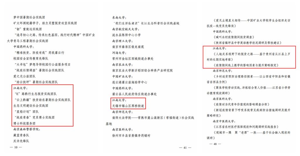 其中,校团委荣获“社会实践先进单位”;“E”路黔行生态脱贫实践团队、“云上黔疆”扶贫助农暑期社会实践团队、生态文明建设社会实践团、“星焰计划”团队、“战疫青春”党员博士实践团、博士科技服务团共6支队伍荣获“社会实践优秀团队”;江一禧、管明乐、刘舒婷、原韵、李昌昊、王鹏威、刘玉彬、薛晶星共8人荣获“社会实践先进个人”;何涛、王晖、吴垚、奚晓岚、沈丹共5人荣获“社会实践先进工作者”;设计学院——无锡市锡山区厚桥街道荣获得“优秀社会实践基地”;法学院《人地关系视野下的脱贫之路——基于贵州省从江县上歹村的长期实地考察》和人文学院《疫情期间线上教学的影响因素与提升策略探究》荣获“优秀调研报告”。