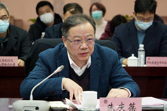 朱庆葆在讲话指出,2021年是“十四五”市校合作共建启动之年,在市委、市政府关心支持下,江南大学在主动服务无锡经济社会发展的过程中实现了动能叠加、势能集聚、效能提升,市校合作共建的力度、广度、深度达到了全新水平,市校双向赋能、同频共振、共兴共荣的新发展格局已然形成。他希望,学校各有关部门、单位和全体师生员工要砥砺奋进、趁势而上,一是加强顶层设计,在新阶段构建新格局,坚持将市校合作共建作为一项系统性、引领性和长期性的战略工程,按照共建战略目标和任务要求,强化引领推动,健全保障机制,聚焦重点、靶向发力,主动构建高质量推进市校合作共建的新发展格局。二是把握关键重点,在新征程展现新作为,坚持“四个面向”,瞄准“未来赛道”,紧密围绕“太湖湾科创带”“梁溪科技城”“霞客湾科学城”建设及“数字经济”等重点领域,引导各学院各部门有序协作、无缝对接、形成合力,服务无锡“四大名城”建设。三是提升服务能级,在新起点勇挑新重担,坚持更高标准、更高定位、更高要求,在健康无锡、教育强市、文化强市建设等方面抢抓机遇、主动作为、勇担使命,拓展合作领域、创新合作方式、落实合作项目,为无锡打造践行新发展理念高质量发展示范区贡献更多智慧和力量。