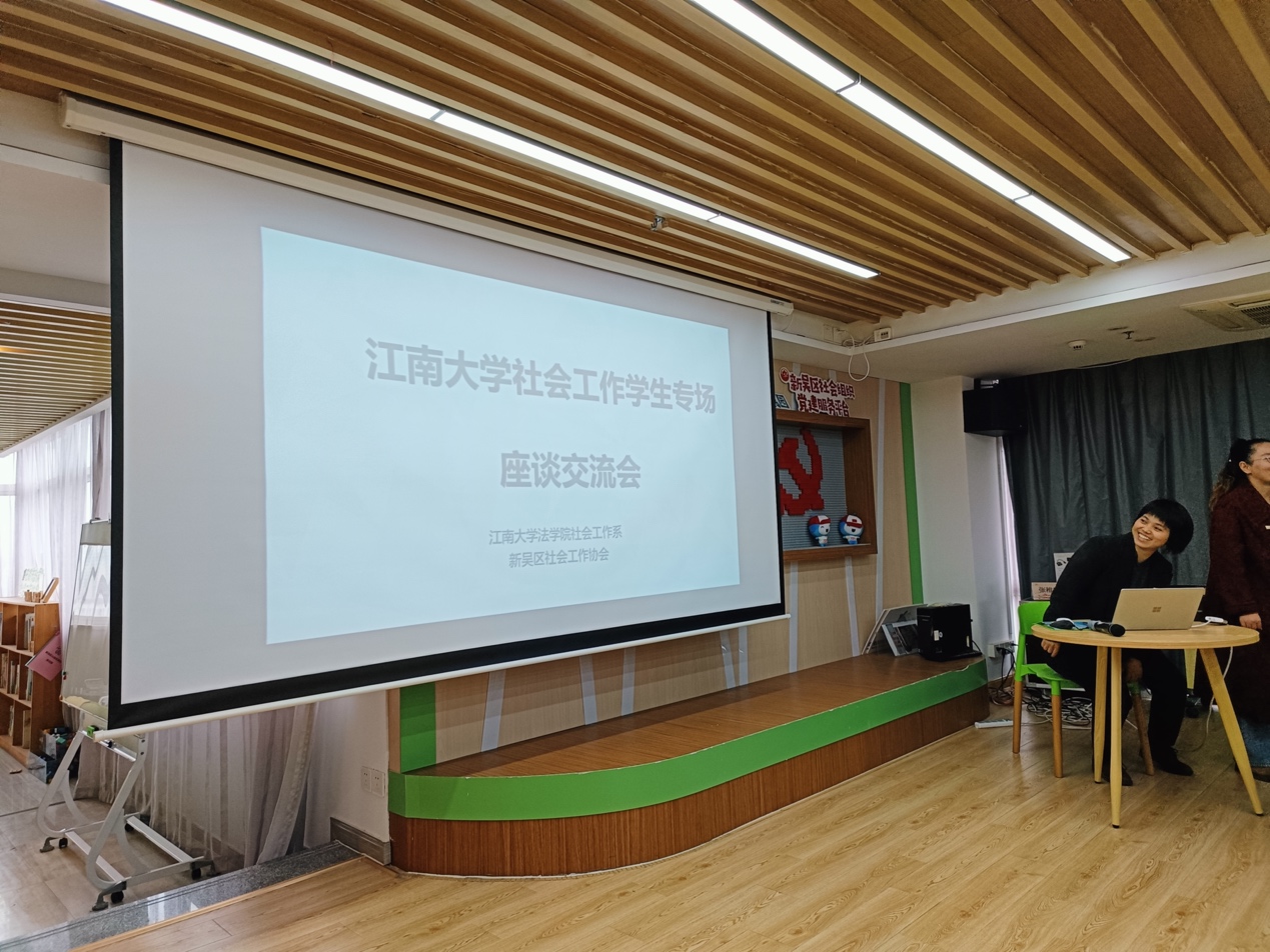 活动的第二部分是座谈会环节。新吴区社会工作协会副秘书长彭颖作为法学院社会工作专业的优秀校友,结合自身经历与同学们分享交流了自己从业近十年的经验。她向同学们介绍了新吴社协的发展历程、服务理念、业务领域,分享了自己的工作心得,解答了同学们的提问,并给同学们的学习和职业生涯规划提出了相关建议,希望同学们多多参加社会实践活动,在实践中提升专业素养和职业能力。