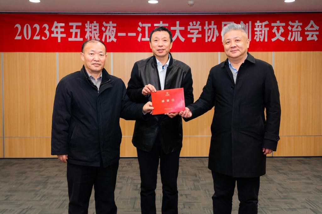 1月10日下午,五粮液股份公司技术总顾问赵东一行访问江南大学,就校企协同创新进行了交流,并转交了由五粮液集团(股份)公司党委书记、董事长曾从钦签署的感谢信,感谢江南大学为五粮液科技创新作出的重要贡献。校党委常委、副校长顾正彪,“五粮液-江南大学微生物组学与生态发酵技术协同创新实验室”主任徐岩以及实验室成员出席交流会。