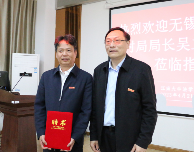 会上,吴正国代表学校向吴立刚授予了江南大学法学院研究生导师聘书,为其佩戴了江南大学校徽。吴立刚表示非常荣幸成为江南大学法学院研究生导师,感谢江南大学对他的信任,他希望借助江南大学的学术科研、人才资源,全面激发无锡农业农村发展活力,为乡村振兴贡献力量。