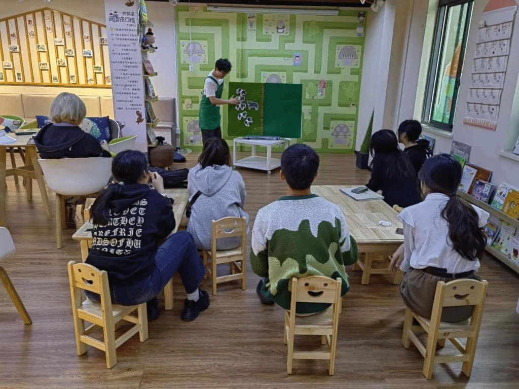 “问心公益人走进老约翰绘本馆”活动期间,在盖中辉和工作人员的指导下,小组成员以亲身体验感受绘本所蕴藏的魅力,通过工作人员以绘本带读、绘本剧场形式的生动有趣的绘本课堂,沉浸式体验了“儿童绘本阅读的快乐”。小组成员深入调研绘本馆的基本情况,包括馆藏、服务内容、发展历程以及市场趋势,详细了解老约翰绘本馆从2012年最初的亲子阅读推广发展到集研学、阅读等为一体的综合性民营机构的模式以及未来发展路径。