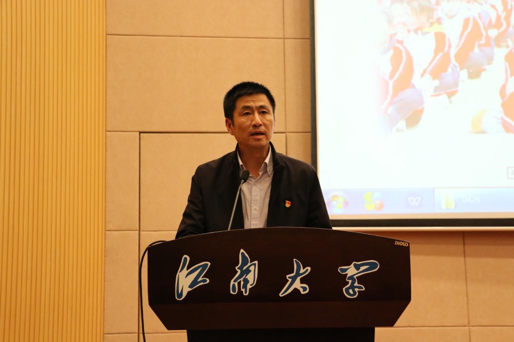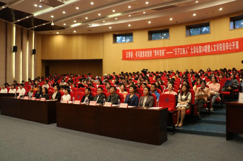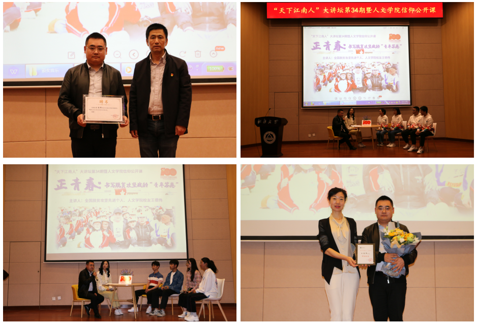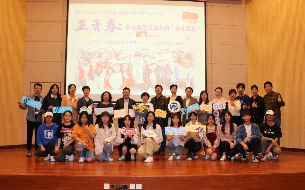 为传承五四精神,引导江南学子树立教育报国理想,4月29日,“正青春:书写脱贫攻坚的‘青年答卷’”——“天下江南人大讲坛”第34期暨人文学院信仰公开课活动在远东报告厅隆重举行。本次活动由江南大学社会资源处、江南大学学生工作部(处)、共青团江南大学委员会主办,江南大学人文学院承办。受党中央、国务院表彰的“全国脱贫攻坚先进个人”、人文学院小学教育专业2015届校友王德伟结合教育援藏经历进行了精彩分享。江南大学党委副书记戴月波、人文学院党委书记姚剑英、副院长(主持工作)田良臣、社会资源处副处长窦新华、学生工作部副部长李荣华、人文学院党委副书记兼副院长李萍、小教1101班班主任肖凌燕、人文学院原2011级辅导员徐璐等老师与300余名学生代表共同参加了活动。
