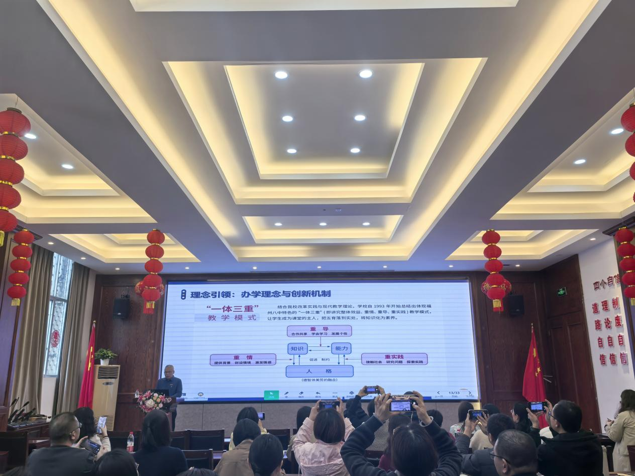 有着悠久历史的福州第八中学,是研学的第二站,该校前身为清朝咸丰年间创办的私立文山女子中学。陈鸿校长带领学员们一起参观校史馆,并作《高品质学校建设的追求与实践》主题分享。不仅阐述了办学理念、创新机制及“一体三重”(讲究整体效益、重情、重导、重实践)的教学模式,还强调花园式育人环境的营造。教务处主任林奇峰在《一体三重 苦干向上》讲座中,进一步展示教学常规管理工作细则,借助学习金字塔方式构建知识体系,介绍课后服务计划,凸显团队与数据意识。德育处主任郑杜平的《三自成长 五育向美》,聚焦初中部育人整体架构,强调劳动在树德、增智、强体方面的重要性。讲座结束后,校长们还参与观察了该校学生农场的磨豆腐实践活动,亲身体验校园生活实践教育的魅力。