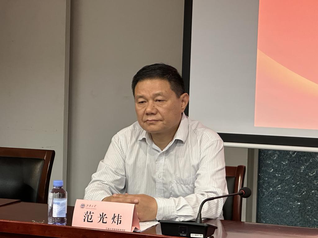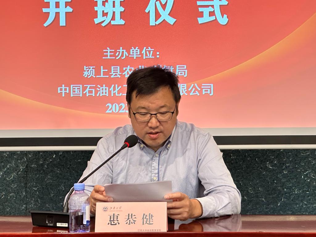 惠恭健致欢迎辞。他首先对颍上县基层农技人员来学院培训表示欢迎。随后他简要介绍了江南大学的历史底蕴、一流学科建设成果,以及继续教育学院在致力于终身教育体系构建,学习型社会建设方面的努力及丰硕成果。最后,他希望此次培训的课程能为颍上县乡村振兴工作发展提供指导与帮助。