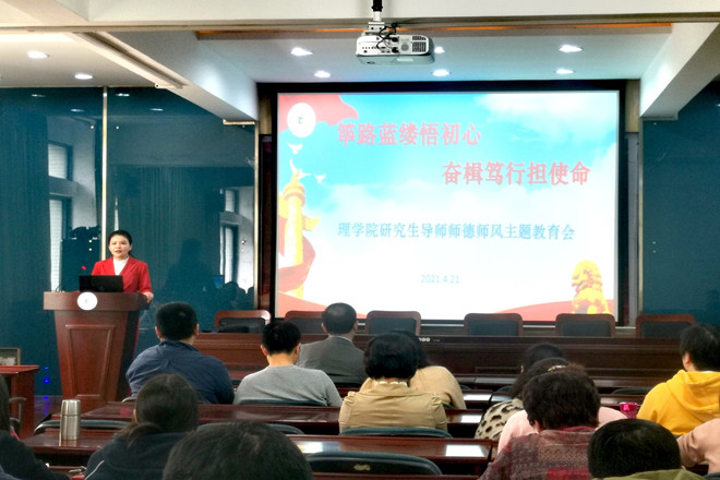 在临近庆祝党百年华诞的重大时刻,为贯彻落实习近平总书记在全党开展党史学习教育动员大会上的重要讲话精神,用党的奋斗历程和伟大成就鼓舞斗志、明确方向,用党的光荣传统和优良作风坚定信念、凝聚力量,加强学校师德师风建设,营造风清气正的校园氛围,理学院积极开展系列学党史悟初心、以史为镜担使命立师德活动,大力发扬红色传统、传承红色基因。4月21日,在理学院202会议室以“筚路蓝缕悟初心 奋楫笃行担使命”为主题召开了全体硕士生导师师德师风主题教育会,全体研究生导师和即将成为研究生导师的青年教师参加了本次会议,会议由副院长高洁主持。