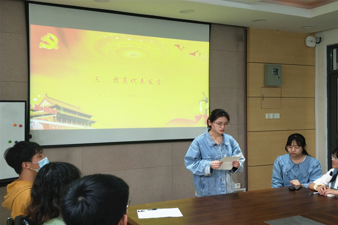 随后,信计2001班申芷欣作为团员代表发言,她提到如今正逢我党百年华诞重大时刻,处于“两个一百年”奋斗目标历史交汇的重要节点,青年团员需行动起来,以崇仰之情认识党的历史,以敬畏之志对待党的历史,并从中汲取经验和力量。