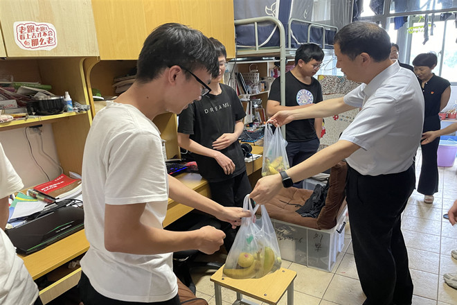 走访过程中,王珏和陈国庆亲切询问大家是否适应留校生活,有没有遇到什么困难,如若遇到学习或者生活上的困难,可以随时向学院、班主任、辅导员老师们反馈,学院一定会想方设法予以解决。对于院领导们的亲切慰问与关心,同学们感到非常的暖心与开心,表示虽是疫情期间留校,但在学校与院系的支持与关心下,暑期学习与生活很顺利,并表态一定会带着学校和学院的关爱和温暖,坚决支持学校的工作,做好自我管理,保质保量的投入到学习中。