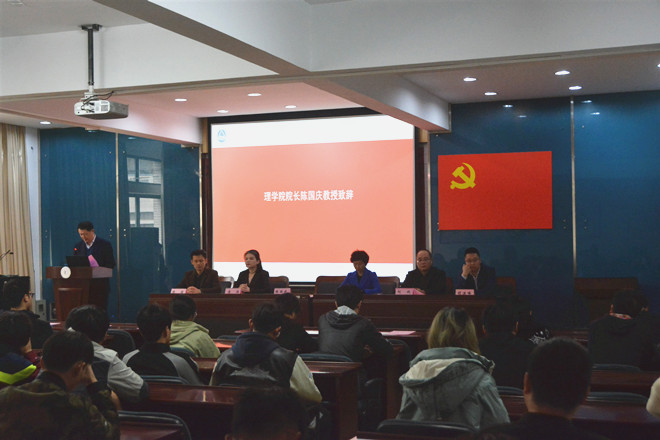 典礼伊始,陈国庆致辞。他首先对多年来一直关心和支持学院发展的吴新校友表达了崇高的敬意和衷心的感谢,对获奖同学表达了热烈的祝贺。理学院一直坚持将人才培养作为学院立德树人的重要任务,设立奖学金是人才培养工作重要的一环,鼓励先进人才,奖优促学。他对获奖同学们提出三点希望:一是坚持家国情怀,放眼未来世界;二是坚持奋斗求学,致力科研创新;三是坚持感恩之心,积极回报社会。希望同学们可以谨记“厚重数理,博学至新”的院训,以及“笃学尚行,止于至善”的校训,在实践中锻炼成材,报效祖国,感恩社会。