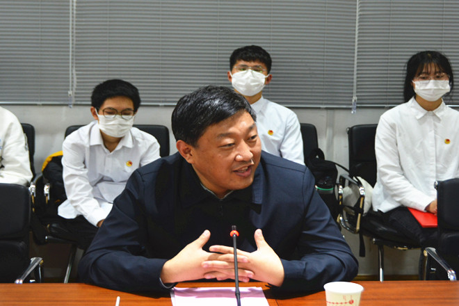 刘淼认真听取师生发言,并作总结讲话。首先,他对班团支部成员的精神面貌,对师生在学习,竞赛和蓝阶梯乡村振兴团实践方面的奋斗劲头表示肯定,期待后期有时间也能和同学们一起参与到这个实践活动中。他表示很高兴参加这次团日活动,希望同学们能做到四个“读懂”,读懂中国、读懂世界、读懂时代、读懂自己,做有益于他人,有益于国家的时代新人,从而成就更好的自己。最后,他送给同学们“善良、快乐、智慧、道义”四个成长法宝,学会正确看待得失,勇于承担起责任和使命。