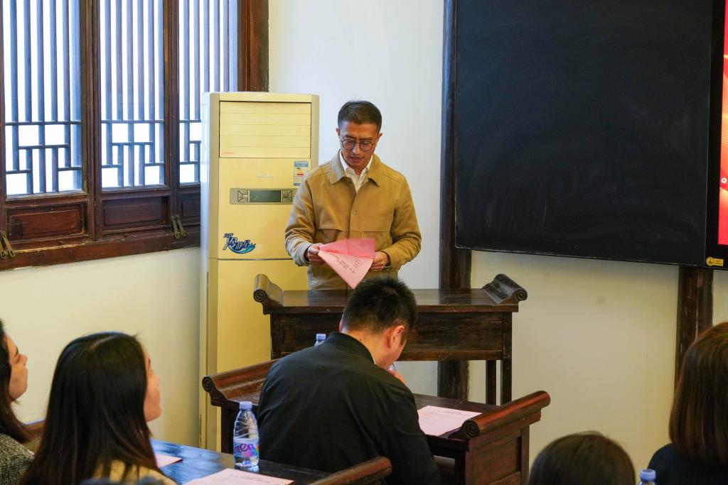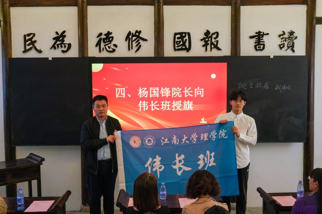 开班仪式在与会人员高唱国歌中拉开帷幕。王珏致开班辞,首先向钱穆·钱伟长故居的大力支持和热情接待表示衷心感谢。她简要介绍了钱伟长老先生的生平事迹和突出贡献,回顾了钱老与江南大学及理学院的不解之缘,指出学院把拔尖人才培养实验班命名为“伟长实验班”,既是对钱老的深切勉怀,也饱含着对学子的殷切期盼。她希望伟长班学子要学习钱老热爱祖国、情系人民的崇高品德和勤于钻研、勇于创新的科学精神,不负时代所托和学院期盼,以实际行动成长为厚基础、重能力、强素质、有情怀的拔尖创新人才,为建设伟大祖国贡献力量。