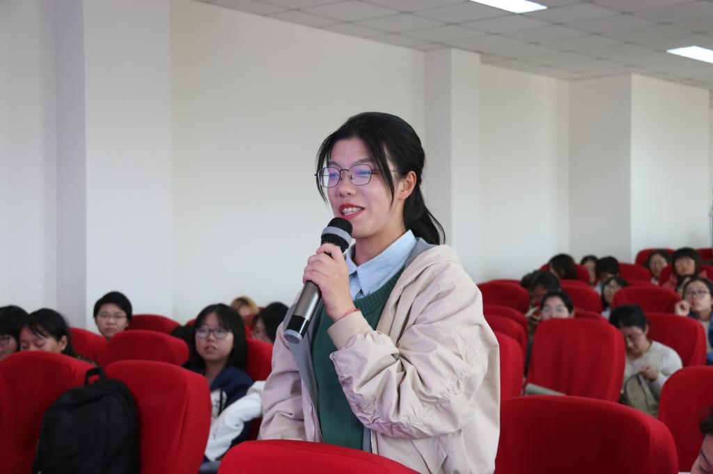 在互动提问环节,同学们就“食品添加剂的使用标准”和“食品中添加剂的功能”等问题向徐老师请教,徐老师从我国国情及群众认知方面为同学们详细解释,会场氛围十分活跃。
