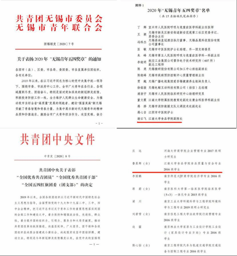 今年五四期间,除了食品学院副院长谢云飞教授获得无锡五四青年奖章外,食品学院大四学生鲁晨辉由于在社会实践、志愿服务等方面的突出表现,获得“全国优秀共青团员”的荣誉称号。在接受“中国青年网”的采访中,她表示,“青年人的奋斗不仅仅体现在书本上的知识,更要学会在实践中体悟。要双脚扎根土地,将书本知识融入实践,更要在实践中感悟真理。”