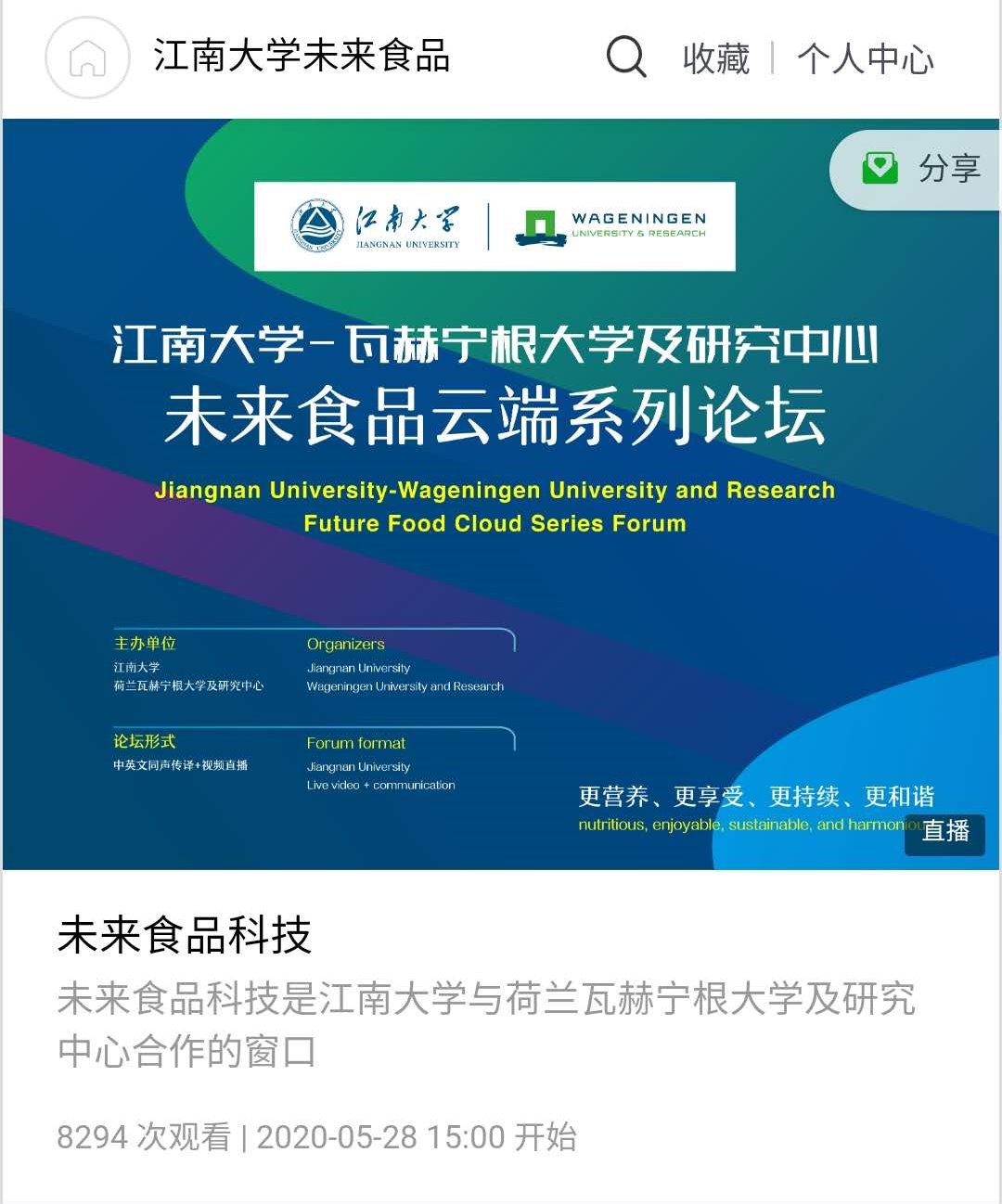 “江南大学-瓦赫宁根大学及研究中心未来食品在线系列论坛”是由江南大学和荷兰瓦赫宁根大学及研究中心共同发起的针对全球未来食品发展的在线国际系列研讨会,会议共分为六期举行。本次会议是系列论坛的第一场,是由江南大学和瓦赫宁根大学及研究中心共同主办。计划通过系列论坛的举办,能够为国际食品科学工作者提供交流、拓展科研合作的良好平台,并促进食品学科未来发展的国际交流与合作。