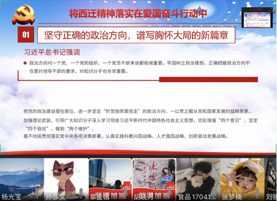杨光宝首先带大家观看了4月22日习近平总书记在西安交大的讲话视频,并讲解了交通大学西迁的历史背景,包括学校的建设、师资力量的组成以及党和政府的大力支持,了解西迁精神的由来。随后,他讲解了西迁精神的形成及发展,以及近些年党和政府对西迁精神的弘扬和发展。最后提出现阶段要将西迁精神落实在爱国奋斗行动中,广大党员同志要坚守正确的政治方向,谱写胸怀大局的新篇章;要秉持爱国奋斗的价值追求,续写无私奉献的新故事;要弘扬知识分子的家国情怀,绽放优良传统的新光芒;要凸显敢为人先的精神品格,开启艰苦创业的新征程。