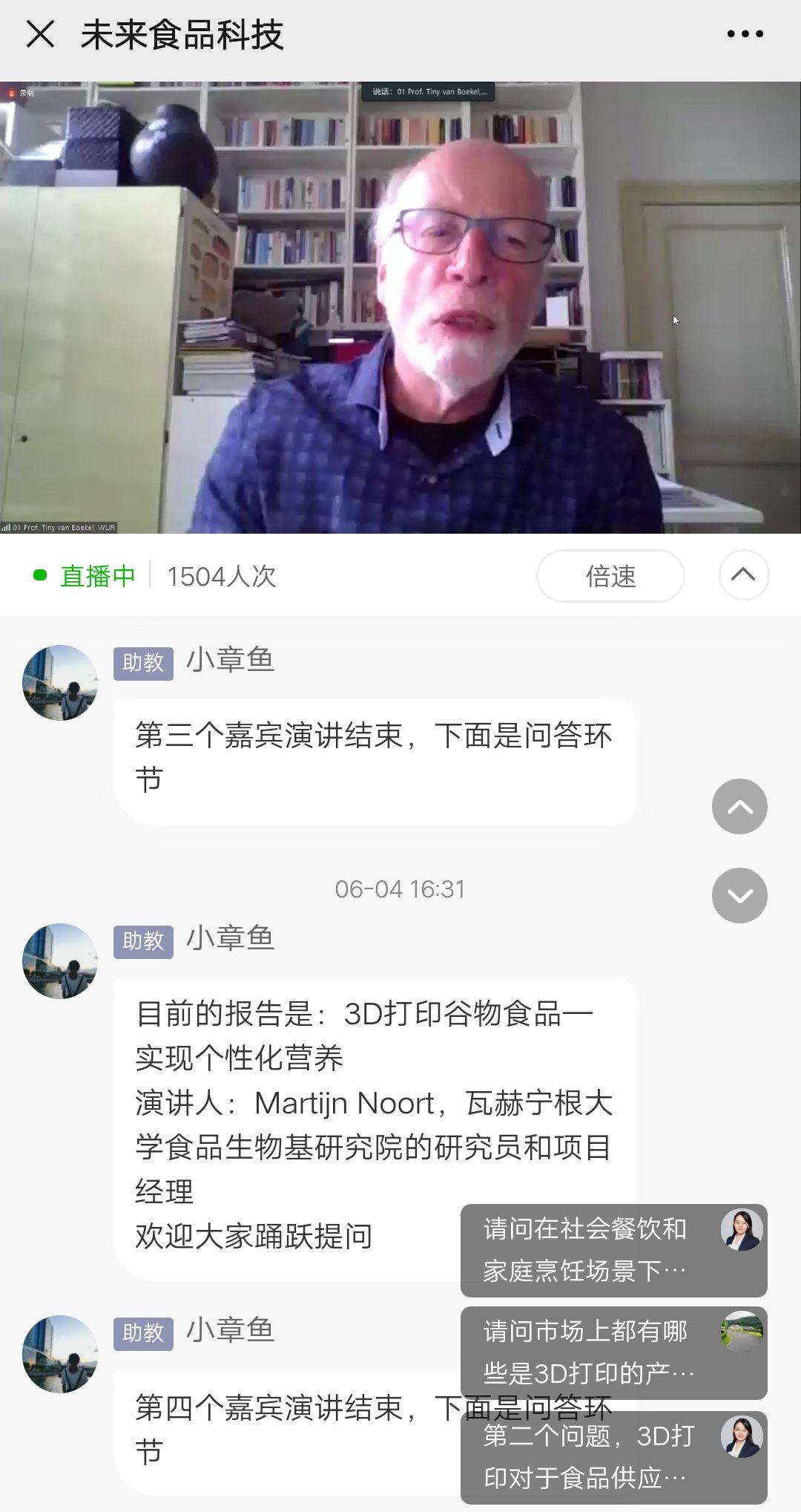 在会议进行过程中,会场提问区反响热烈,新问题与新思路不断涌出。与会者通过与几位专家、学者的交流与讨论,认识到3D打印食品作为未来一种新型的食品生产技术,拥有广阔的发展与应用前景,并且随着该技术在未来的普及和潜在的商业化应用,必将会在很大程度上改变人们的生活方式和生活品质。