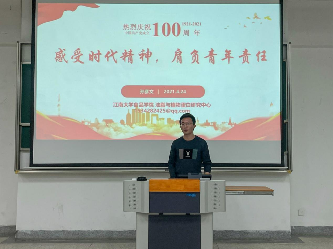 在中国共产党建党100走年之际,为进一步深化学生对党的性质宗旨的认识,提高学生的思想政治觉悟,4月24日晚,食品学院在教学楼2A127举办了“喜迎建党100周年,分享初心故事”主题活动。食品学院生物技术中心博士后田培郡、食硕2005党支部书记孙彦文受邀担任主讲,食品学院2020级全体本科生参加了本次活动。