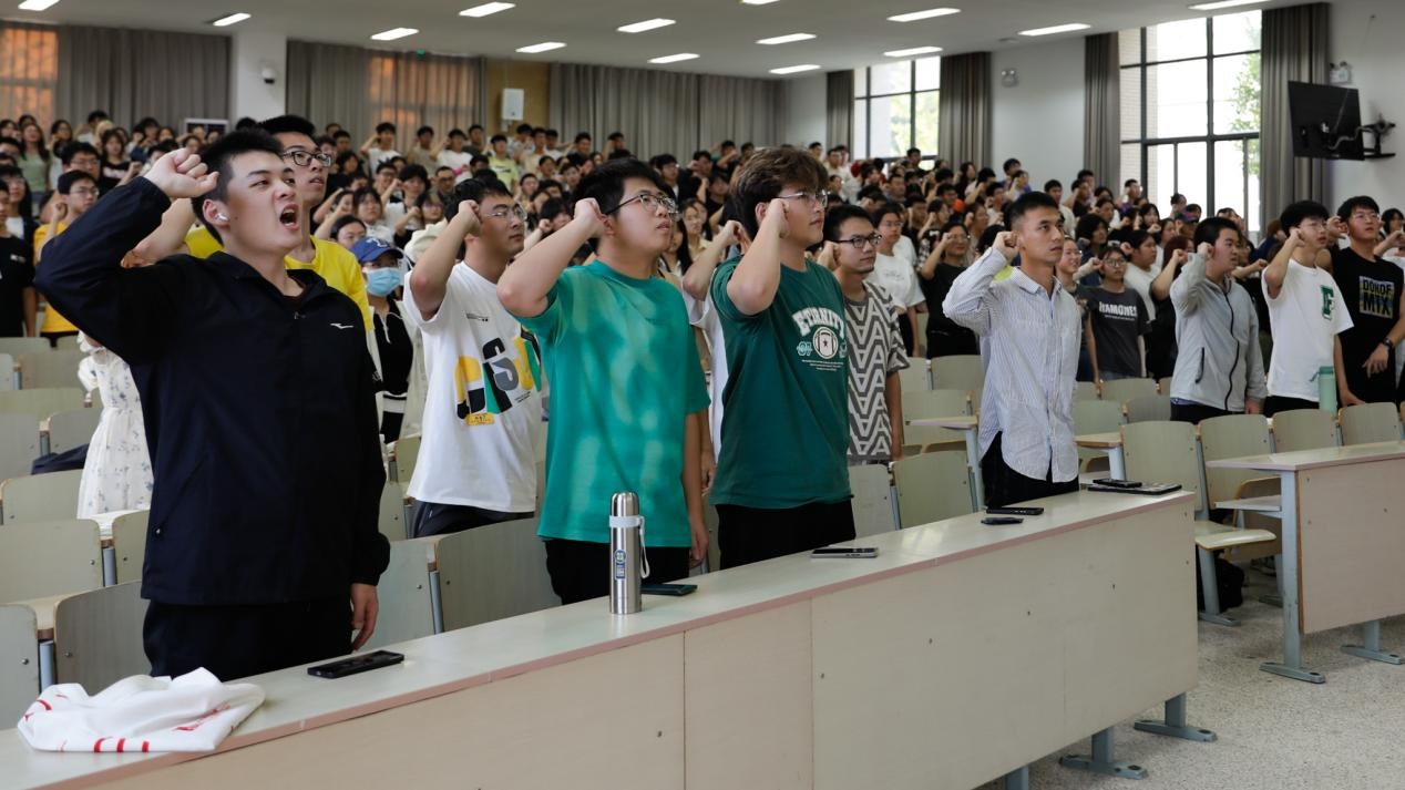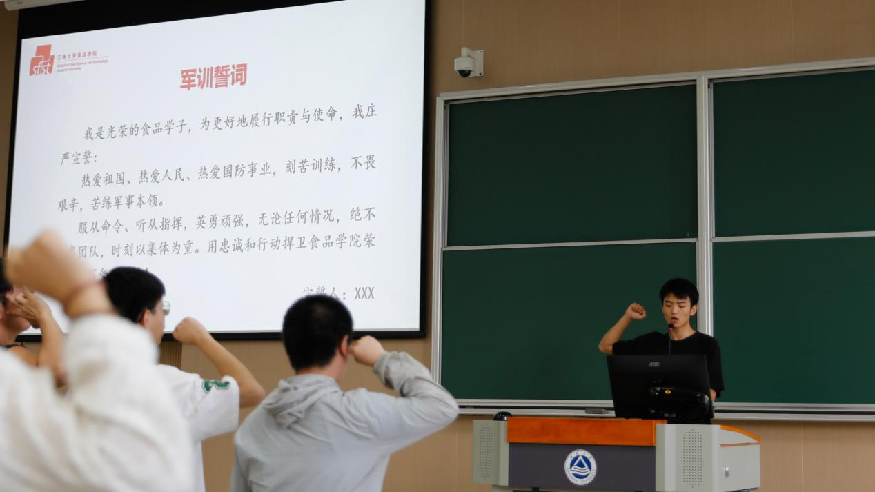 退伍大学生士兵胡加恩发言。他讲述了自己在部队两年的经历,号召同学们勇担时代责任、主动投身军训、锤炼意志品质,努力成长为堪当民族复兴大任的时代新人。食科2206班韩书峤带领全体同学庄严宣誓,将严格遵守纪律,认真投入军训,发扬团队精神,续写食品荣光。