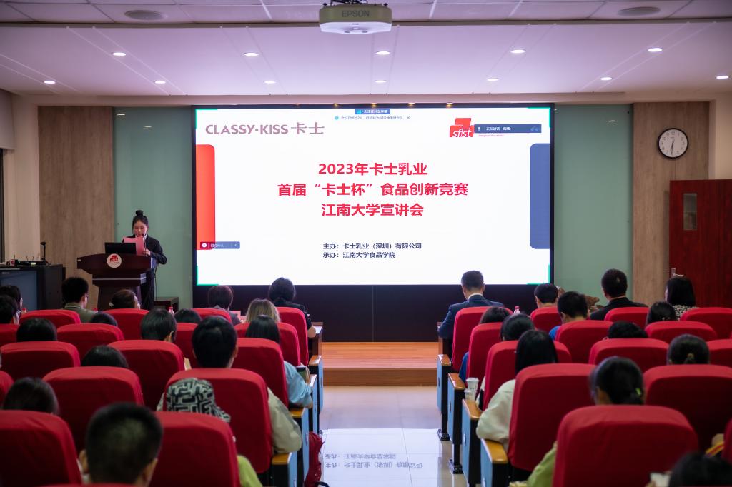 为深入贯彻落实健康中国2030规划纲要,助力现代乳制品产业加速向高品质、高附加值和可持续发展方向转型,同时有效提升食品专业青年学子的创新实践能力,10月19日,由卡士乳业(深圳)有限公司与江南大学食品学院联合举办的首届“卡士杯”食品创新竞赛在我校正式启动。卡士乳业人力总监张会民、研发部负责人俞兰秀、人力招聘专家苏显佳、人才开发负责人胡梦婷,食品学院党委书记傅莉莉、教授卢蓉蓉、副教授李晓瑄、学工办主任兼分团委书记李金杰及300余名在校生参加宣讲会。