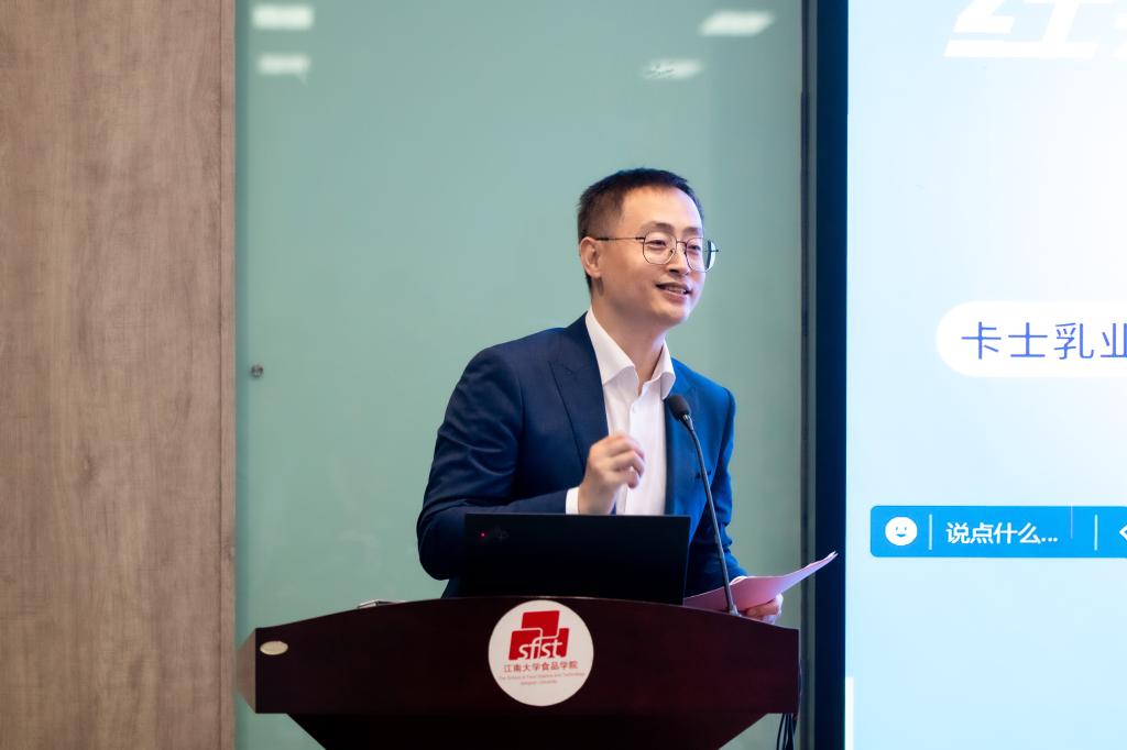 张会民代表卡士乳业致辞并宣讲。他充分肯定江南大学食品学院的学科实力与行业影响,期待在人才培养、科技创新等多领域深化合作。他围绕企业创立及发展、品牌、愿景等展开介绍,并指出,基本品质、产品口感、包装视觉等多维度的全面创新是卡士创造中国乳业奇迹的核心要素。张为民还详细解读了参赛规则、选题方向、作品要求、比赛流程、奖励机制等,鼓励同学们交流、分享、实践、成长。