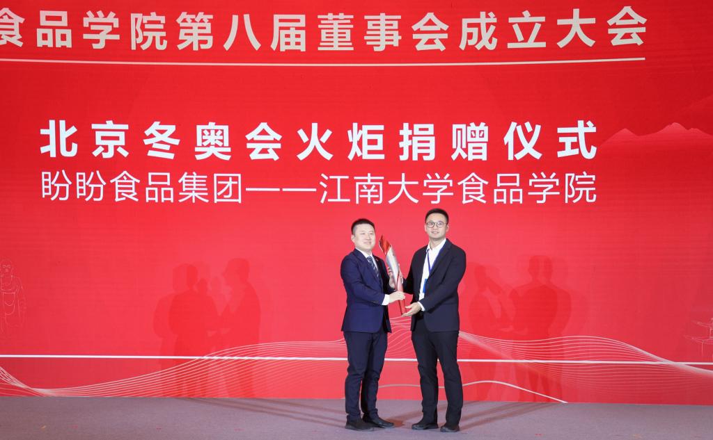 现场还举行“盼盼食品集团——江南大学食品学院”北京冬奥会火炬捐赠仪式。福建盼盼饮料有限公司总经理、伽那食品创始人蔡丕鹏向范大明捐赠火炬。