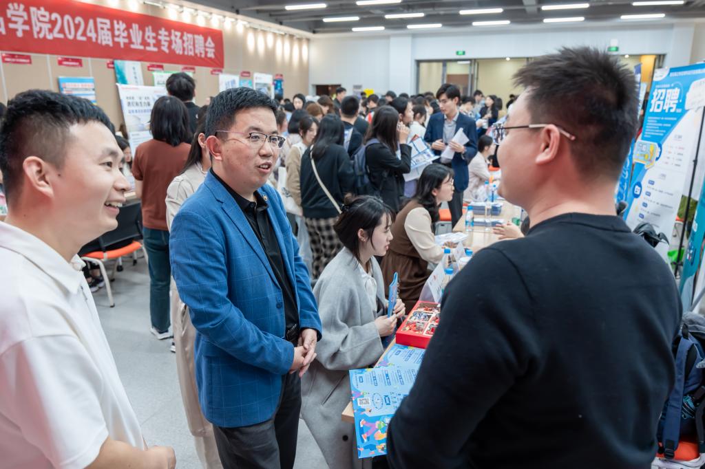 食品学院党委副书记、副院长李雷,学工办副主任吴爽,本科毕业生辅导员王文燕,硕士毕业生辅导员王新磊,博士毕业生辅导员胡卉君前往会场,与用人单位充分沟通,了解当下行业发展状况和人才需求。李雷与求职学生亲切交流,鼓励同学们树立积极的就业择业观念,精准分析自身特点,力争与用人单位实现“双向奔赴”。