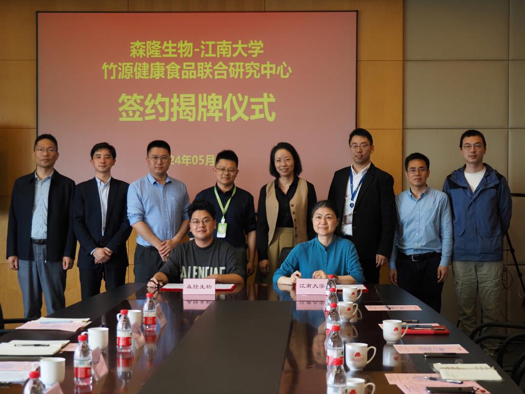 5月6日,“森隆生物-江南大学竹源健康食品联合研究中心”签约揭牌仪式在江南大学食品学院顺利举行。四川森隆生物科技有限公司(以下简称“森隆生物”)总经理严一崴、副总经理曾剑飞、行政总监周琪、研发经理唐方华,江南大学食品学院党委书记傅莉莉、副院长翟齐啸及陈洁、何志勇、曾茂茂教授和陈秋铭副研究员等出席活动。签约仪式由翟齐啸主持。