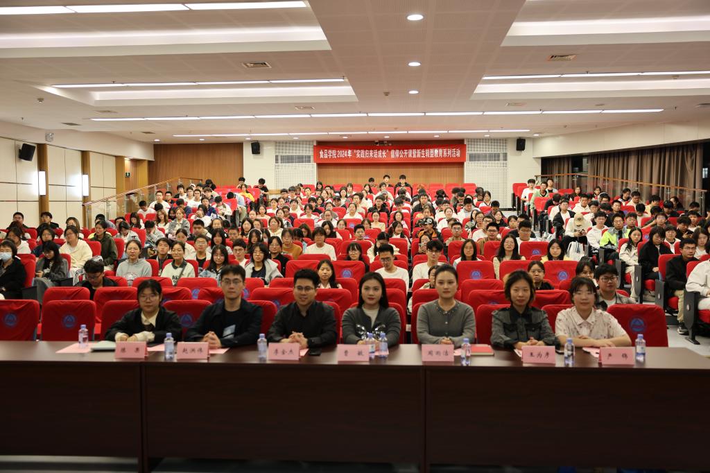 近日,食品学院2024年“实践归来话成长”信仰公开课暨新生转型教育系列活动于图书馆305报告厅举行。食品学院学工办主任兼分团委书记李金杰,2021级本科生辅导员曹敏,2022级本科生辅导员张任,2024级本科生辅导员周雨洁,原团务中心委员赵洪伟,现团务中心骨干成员,暑期社会实践优秀个人、优秀团队代表及2024级全体本科新生参加活动。