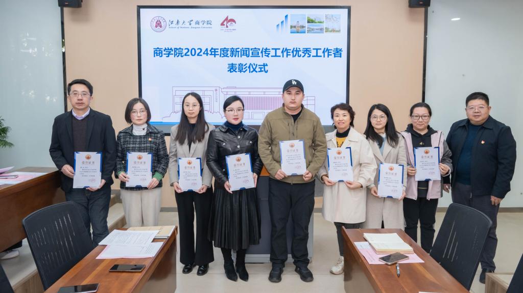 会上,刘长青为商学院2024年度新闻宣传工作优秀工作者和先进个人颁发荣誉证书,鼓励和表彰过去一年在学院新闻宣传工作中表现突出的教工通讯员和学生骨干。