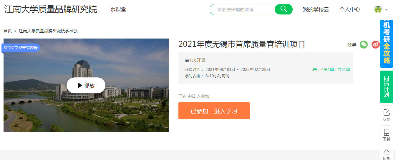 2021年,无锡市首席质量官培训项目由无锡市和江南大学共同建立的“江南大学质量品牌研究院”正式承接。面临严峻的疫情形势,为严格落实学校疫情管控规定,本次《2021年度无锡市首席质量官培训项目》线下培训暂时延期,线上培训仍照原计划进行。