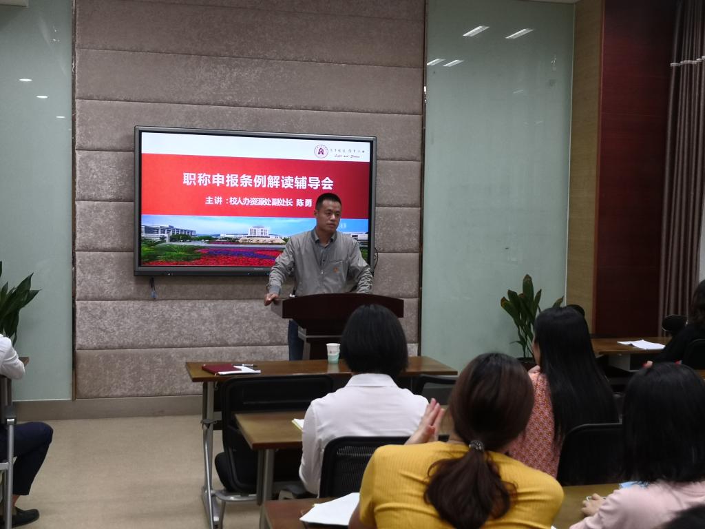 为切实帮助教师了解和理解学校新修订的职称评审政策,加强职称申报过程指导,10月13日下午,商学院邀请校人力资源处副处长陈勇、师资科科长王宇灏来到商学院作职称申报新条例讲解辅导会。商学院院长浦徐进出席会议,现场近30名教师参加会议。
