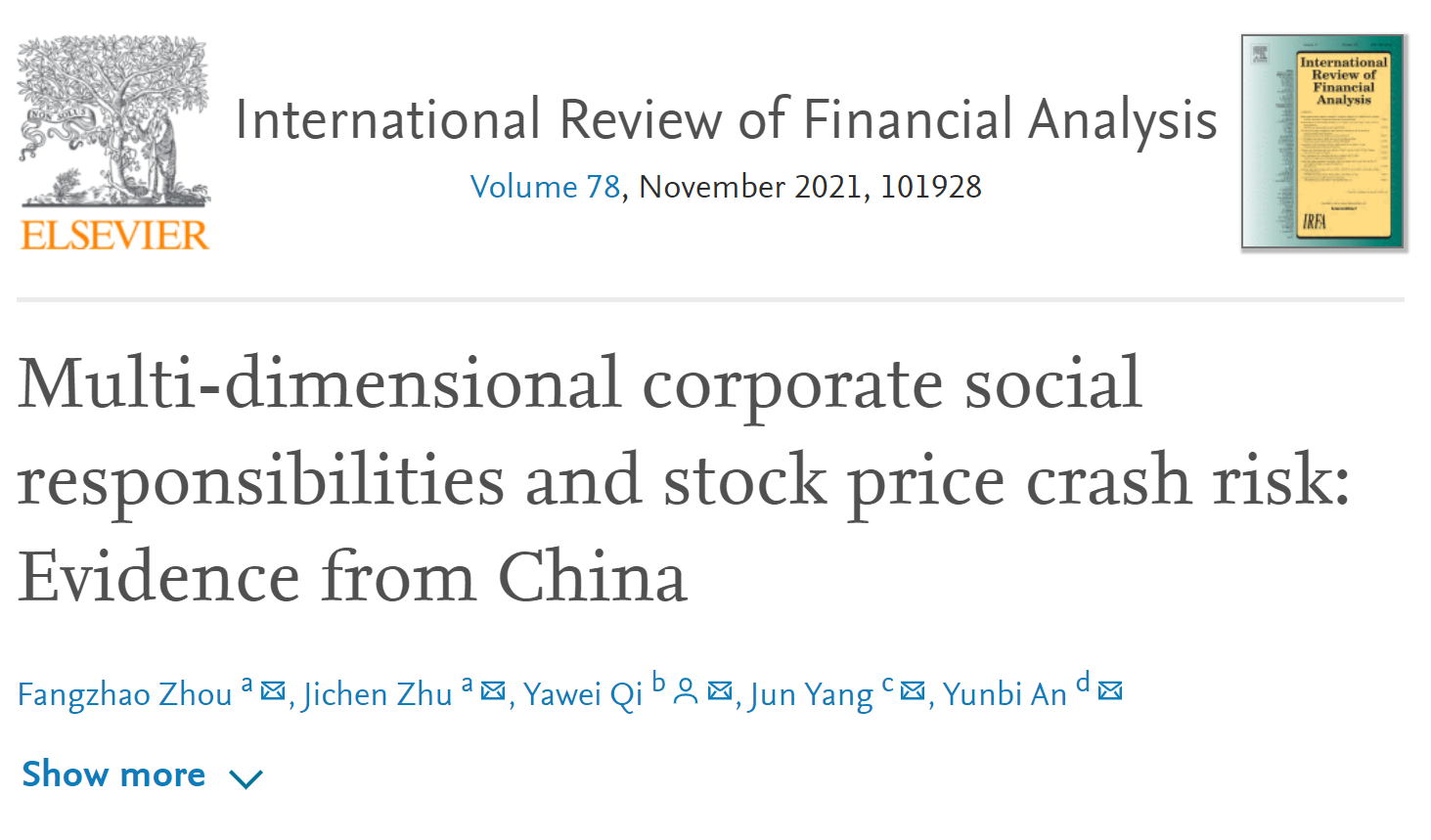 近期,商学院金融系周方召教授(第一作者)与加拿大温莎大学金融系Yunbi An教授等的合作研究成果“Multi-dimensional corporate social responsibilities and stock price crash risk: Evidence from China”发表在国际知名期刊《International Review of Financial Analysis》(Volume 78, November 2021,Impact Factor:5.373 )。